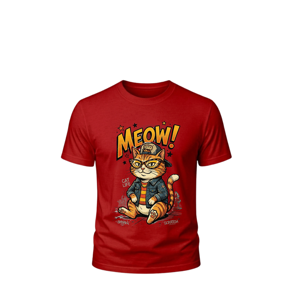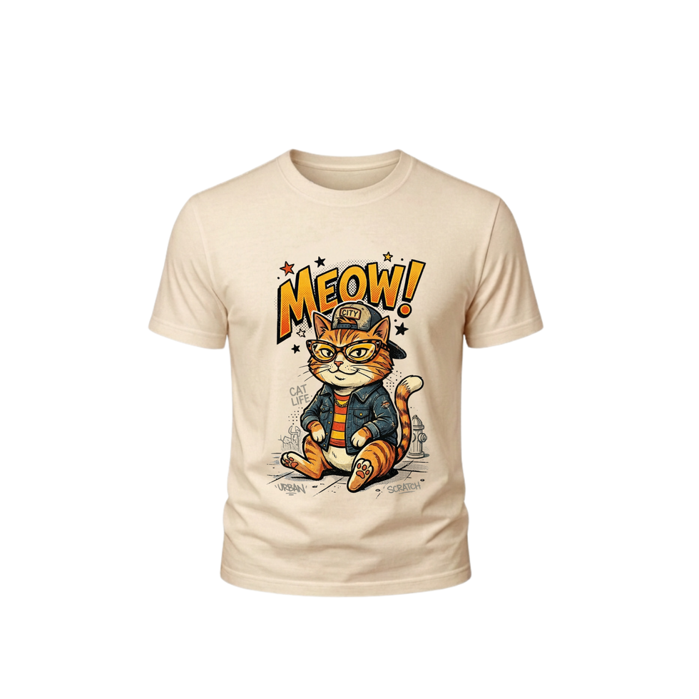 Give your street style a feline upgrade with this bold, comic-inspired graphic tee. Featuring a cool-looking comic cat rocking a classic blue jean jacket and cap, this design is the perfect mix of urban attitude and retro pop-art flair. Finished with sharp "Meow" and "Cat Life" typography, it’s a must-have for anyone who knows how to keep it effortlessly cool.