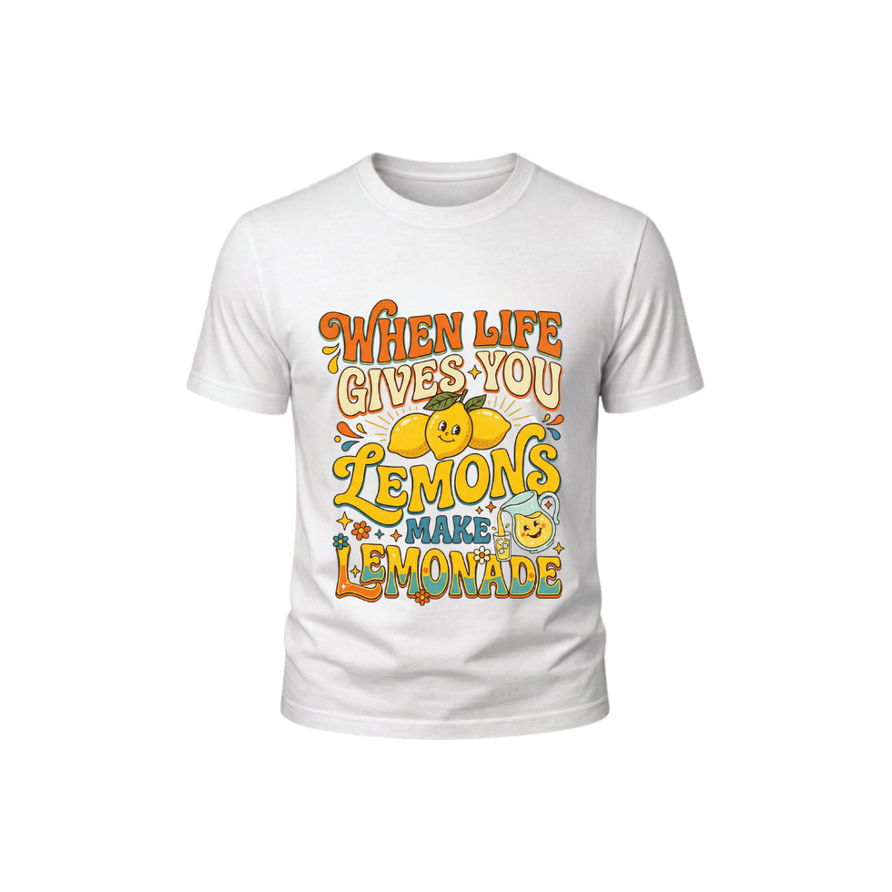 - The "Main Squeeze" Retro Graphic Tee: This vintage-inspired white tee features a groovy, sunset-hued font in bold yellow and orange. Adorned with a trio of fresh lemon graphics, the "When Life Gives You Lemons" mantra gets a stylish, 70s-style upgrade.