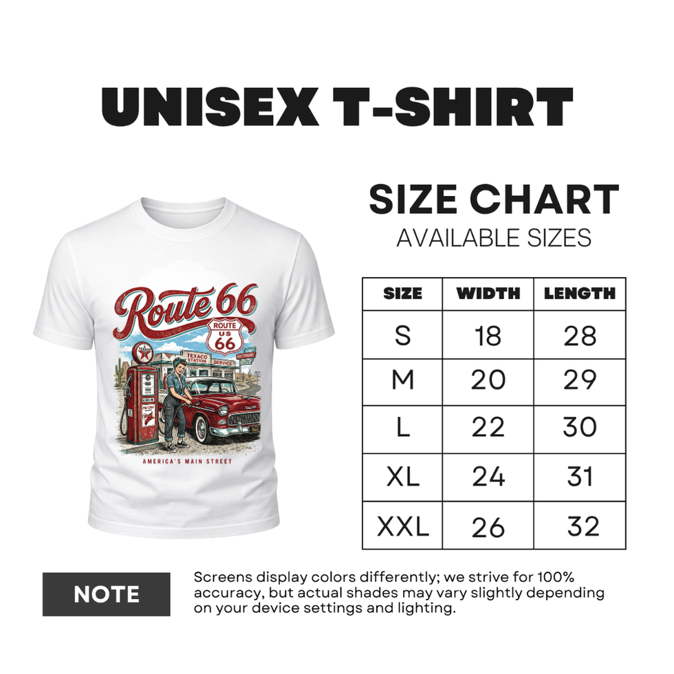 Rev up your style with our Route 66 Vintage Couture T-Shirt. Combining a rugged, sun-drenched aesthetic with a bold, modern edge, this shirt is designed for those who value premium style and effortless confidence. Make a statement with the centerpiece of our brand, featuring a striking retro illustration of a woman pumping gas into a classic vintage car at a desert filling station. It represents a perfect blend of Americana heritage and high-fashion flair.